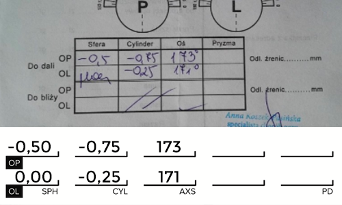 - Na recepcie znajdują się kolejno wartości najpierw dla oka prawego, następnie oka lewego. Następnie najpierw moc sferyczna (sfera, SPH), cylindryczna (cylinder, CYL) oraz oś cylindra (oś, AX, AXS, AXIS).