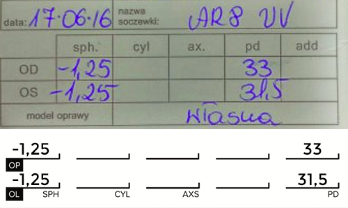 Prawidłowo odczytana recepta. Na recepcie źródłowej znajdują się jedynie informacje dotyczące korekcji sferycznej oraz rozdzielny rozstaw źrenic czyli wszystkie parametry niezbędne do prawidłowego wykonania okularów.
