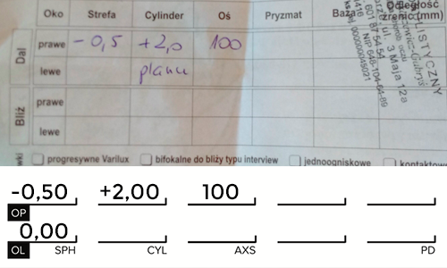 Odczytywane mocy z recepty, zapewnionej przez klienta jest jednym z podstawowych źródeł uzyskiwania mocy wykorzystywanych do wykonania nowych okularów.