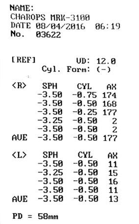 Dioptromierz jest urządzeniem, które służy do sprawdzania mocy soczewek. Wydruk z badania komputerowego (na podstawie którego staramy się nie wykonywać okularów, chyba że taka jest wola klienta) może być podobny do wydruku z dioptomierza (czyli odczytu mocy z aktualnych okularów). Jest jednak kilka szczegółów, które pomogą nam w rozróżnieniu. Oczywiście bardzo ważne jest również zapytanie klienta w jaki sposób uzyskał dany wydruk – pozwoli to na natychmiastową ocenę sytuacji i wydruku.