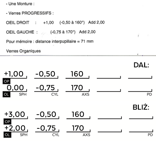 Standardowo recepta w ten sposób wypełniana jest w przypadku, kiedy zalecane bądź proponowane są okulary progresywne. Co bardzo ważne – posiadając taką receptę jesteśmy w stanie przyjąć zamówienie na okulary do dali lub do bliży – nie jest to recepta jedynie „na okulary progresywne lub dwuogniskowe”!
